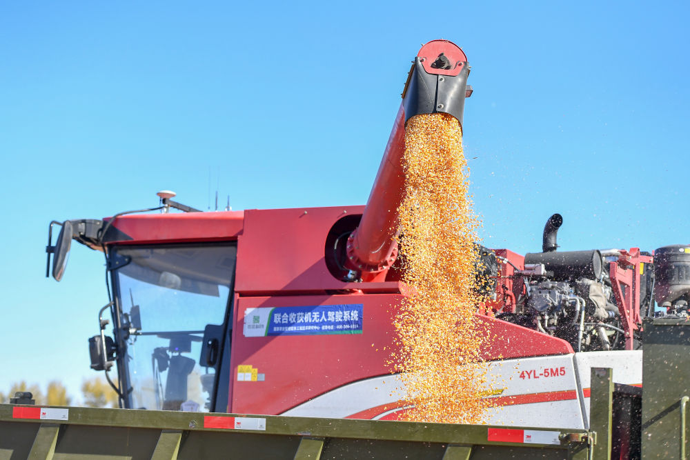 2023年10月19日,在中國(guó)科學(xué)院“黑土糧倉(cāng)”科技會(huì)戰(zhàn)長(zhǎng)春示范區(qū)公主嶺示范基地,無(wú)人駕駛農(nóng)機(jī)將收獲的玉米裝車(chē)。