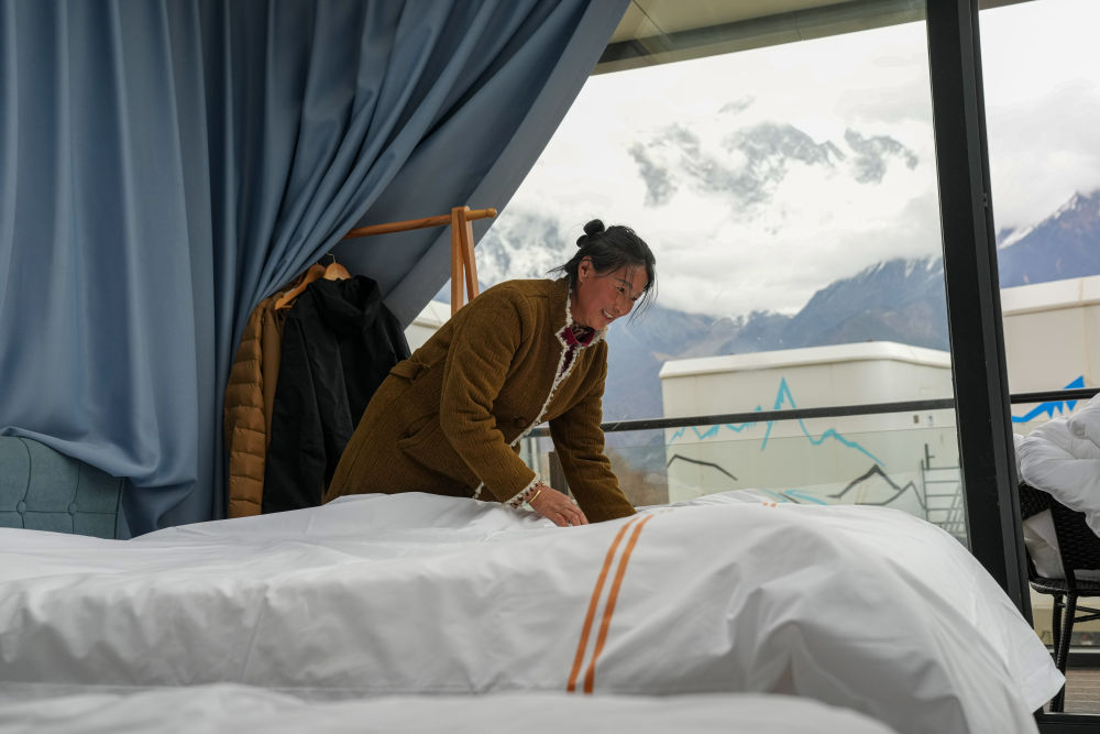 林芝索松村一家民宿的服務(wù)員在整理房間。