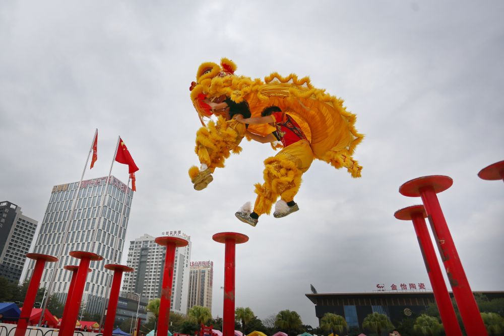 2025年1月22日,鶴山禧誠龍獅隊在廣東省佛山市禪城區(qū)南莊鎮(zhèn)進(jìn)行梅花樁舞獅表演。