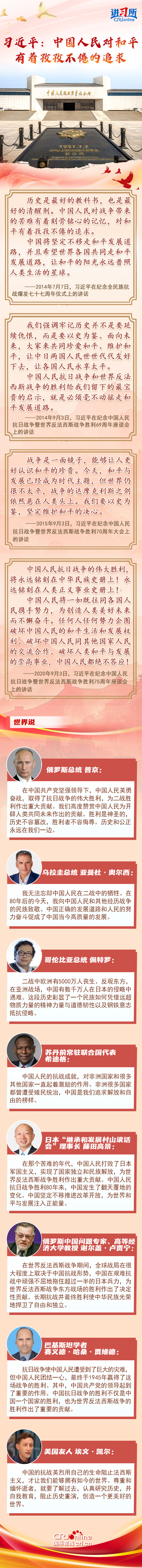 “中國人民抗日戰(zhàn)爭和世界反法西斯戰(zhàn)爭的勝利給我們留下的最寶貴的啟示,就是必須毫不動(dòng)搖走和平發(fā)展道路。”作為世界上唯一將和平發(fā)展寫入憲法和執(zhí)政黨黨章、上升為國家意志的大國,中國始終從歷史中汲取智慧和力量,堅(jiān)定捍衛(wèi)來之不易的勝利成果。在國際友好人士眼中,中國為世界反法西斯戰(zhàn)爭東方戰(zhàn)場的勝利作出了決定性貢獻(xiàn),中國正確的發(fā)展道路和人民的努力奮斗促成了中國當(dāng)今高質(zhì)量的發(fā)展,為世界和平與發(fā)展注入正能量。