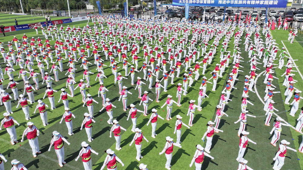 2025年6月10日,群眾在寧夏銀川市金鳳區(qū)覽山公園參加千人健身操展演(無人機(jī)照片)。當(dāng)日,紀(jì)念“發(fā)展體育運(yùn)動(dòng) 增強(qiáng)人民體質(zhì)”題詞73周年全民健身主題活動(dòng)在覽山公園舉行
