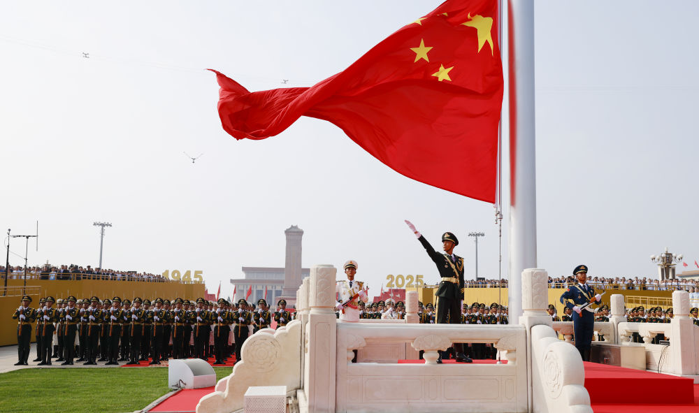 2025年9月3日,紀(jì)念中國(guó)人民抗日戰(zhàn)爭(zhēng)暨世界反法西斯戰(zhàn)爭(zhēng)勝利80周年大會(huì)在北京隆重舉行。這是天安門(mén)廣場(chǎng)舉行隆重的升國(guó)旗儀式。