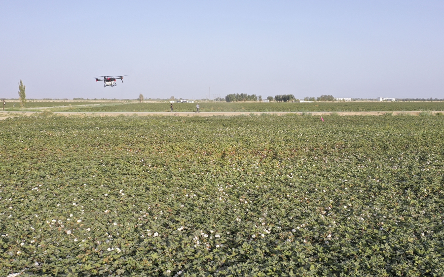 在新疆尉犁縣興平鎮(zhèn)達西村一處高標(biāo)準農(nóng)田,種植戶用無人機噴灑脫葉劑(2022年9月20日攝,無人機照片)。新華社發(fā)(汪志鵬 攝)