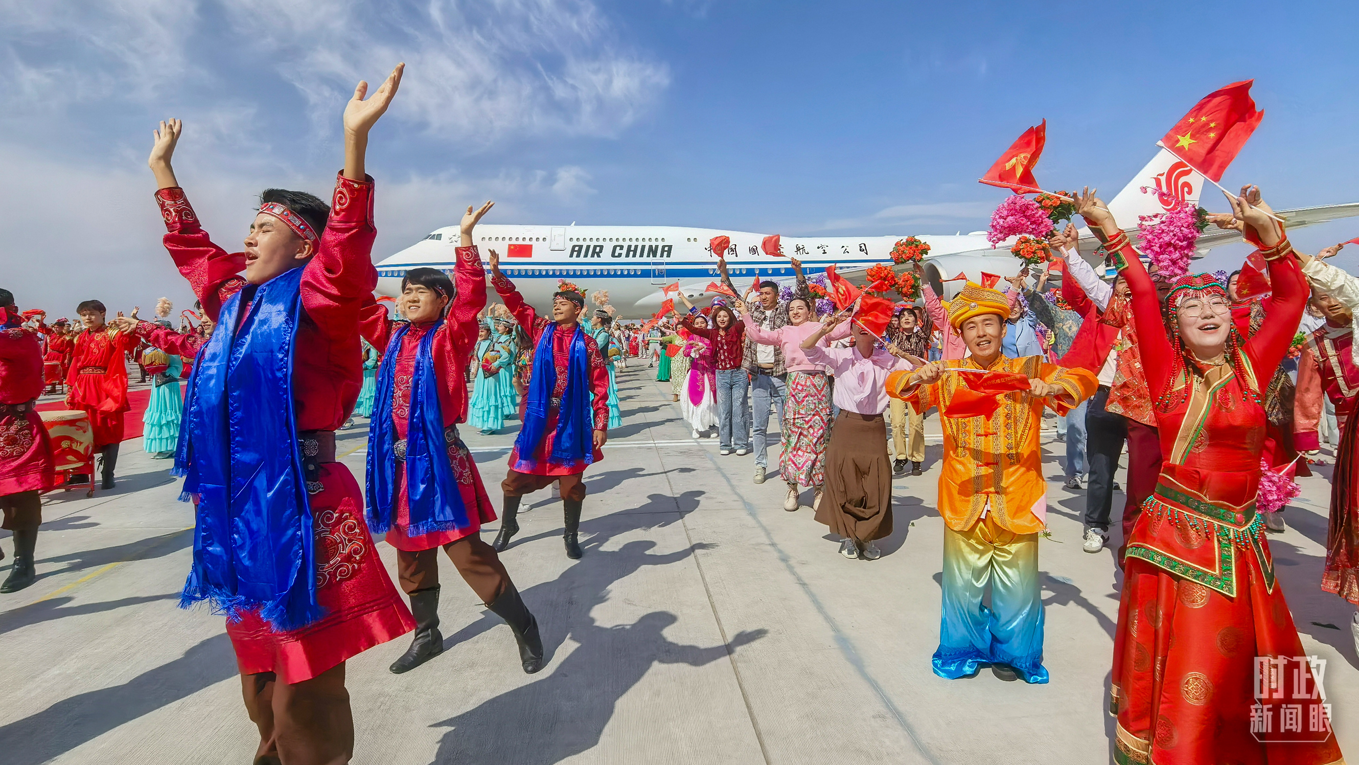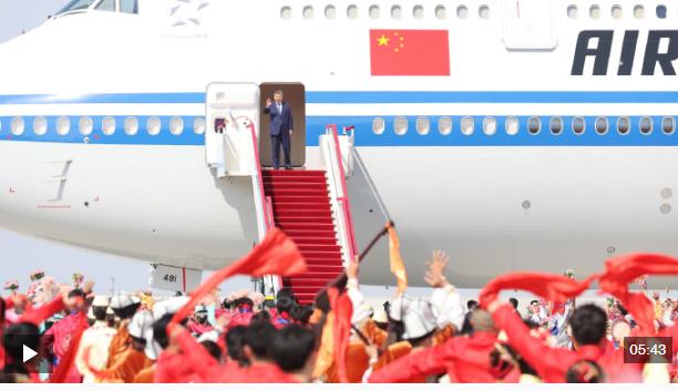 在機(jī)場(chǎng),各族群眾代表身著民族服飾,載歌載舞。從機(jī)場(chǎng)到住地,各族群眾手持紅旗,熱情歡呼,表達(dá)對(duì)總書(shū)記的歡迎和感激之情。
