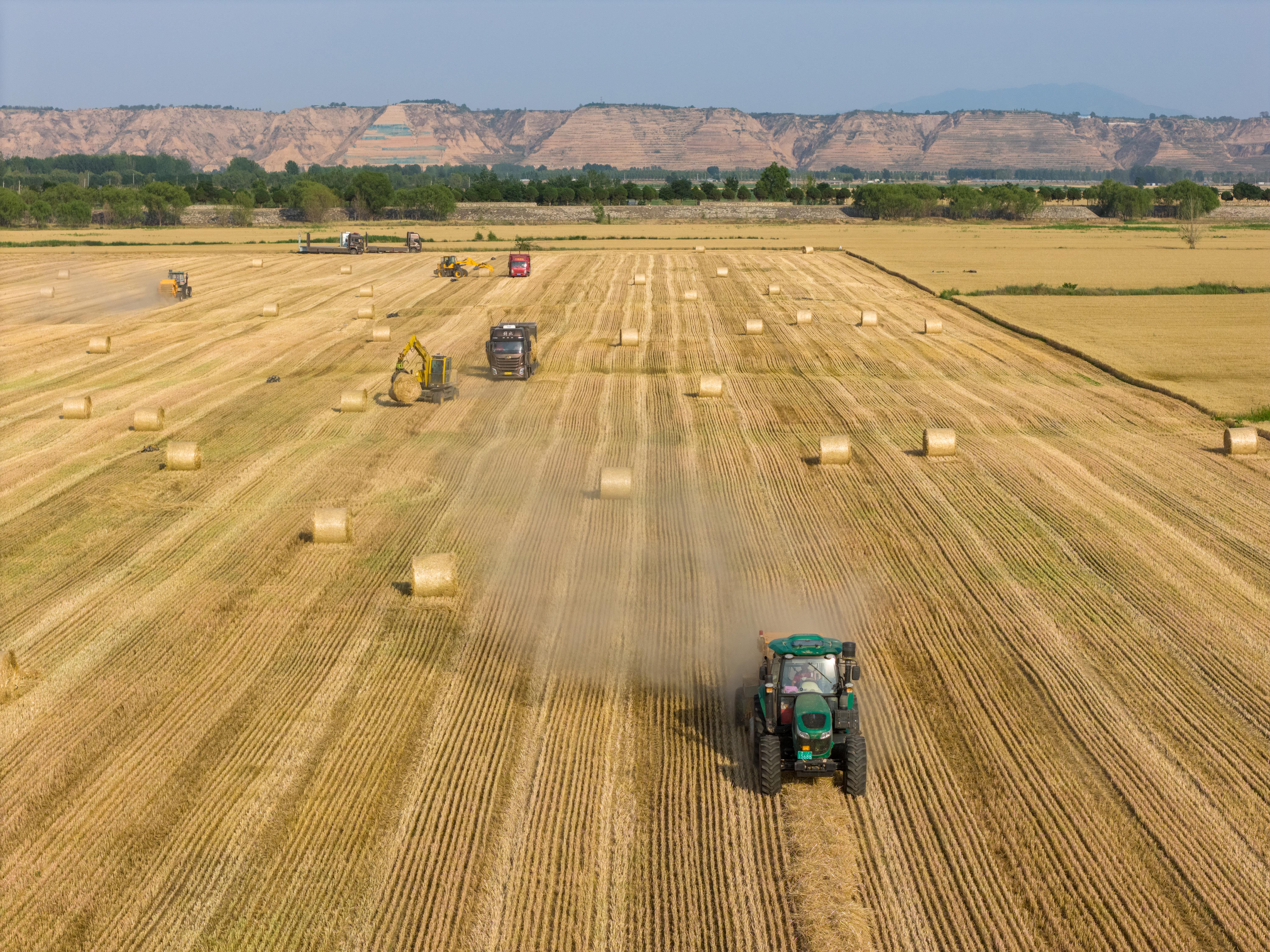 △據(jù)國家統(tǒng)計局發(fā)布的數(shù)據(jù),2025年全國夏糧總產(chǎn)量14973.8萬噸,實現(xiàn)穩(wěn)產(chǎn)豐收。圖為今年6月,山西運城裴莊鎮(zhèn)黃河灘涂上,農(nóng)機手忙著實施小麥秸稈打捆和裝車運輸作業(yè)。