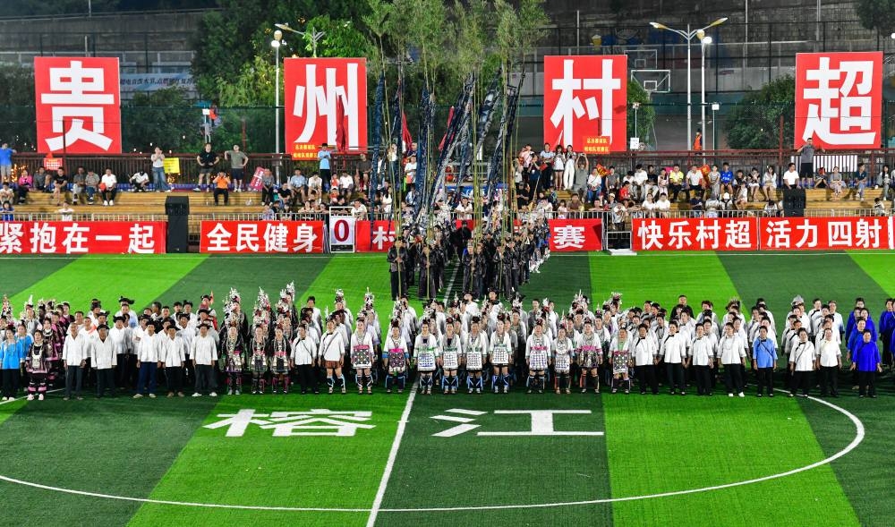 2025年8月23日,村民們?cè)谫F州“村超”球場(chǎng)演唱侗族大歌。當(dāng)日,2025年首屆“村超”全國賽總決賽在貴州榕江縣“村超”球場(chǎng)舉行。賽事期間同時(shí)舉辦豐富多彩的民族歌舞展演、無人機(jī)表演、大型煙花秀,吸引數(shù)萬觀眾現(xiàn)場(chǎng)觀賽。近年來,貴州“村超”“村BA”等草根賽事持續(xù)升溫,巧妙融合體育競(jìng)技、民族文化與文旅消費(fèi),打造“體育+”模式,撬動(dòng)鄉(xiāng)村流量與經(jīng)濟(jì)增量,賦能鄉(xiāng)村振興。