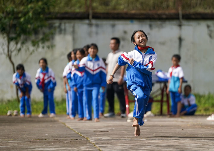 2025年9月15日,云南省普洱市孟連傣族拉祜族佤族自治縣臘福小學(xué)學(xué)生課間在操場進(jìn)行奔跑接力比賽。新華社記者 陳欣波 攝