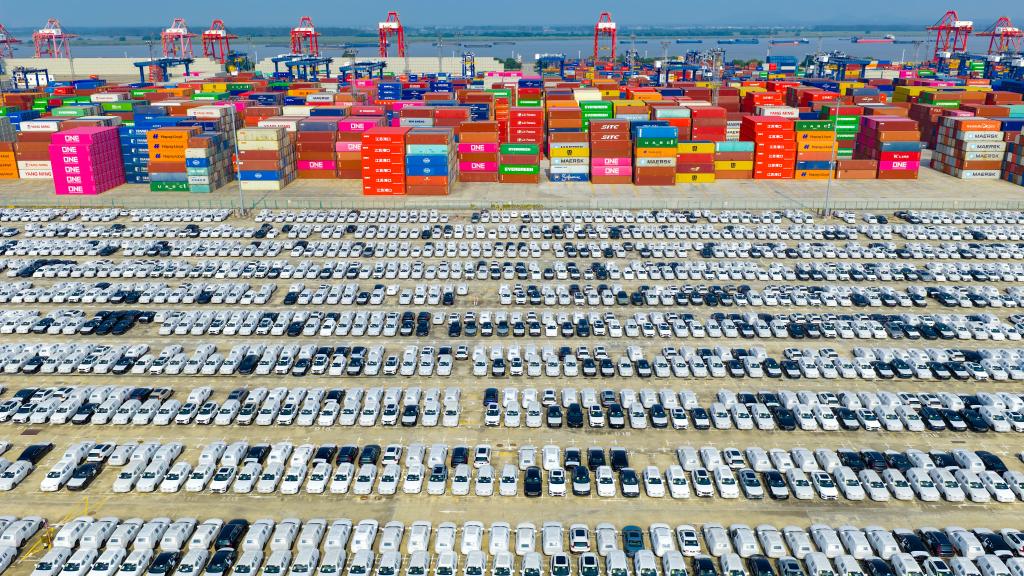 圖為10月4日在江蘇省港口集團(tuán)南京港龍?zhí)陡蹍^(qū)拍攝的準(zhǔn)備裝船出口的汽車(無人機(jī)照片)。新華社發(fā)(楊素平攝)