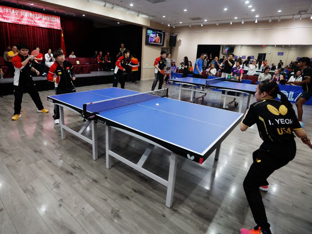 這是7月13日在美國內(nèi)華達(dá)州拉斯維加斯拍攝的紀(jì)念中美“乒乓外交”54周年暨中美乒乓球友好交流活動現(xiàn)場。新華社發(fā)(邱晨攝)