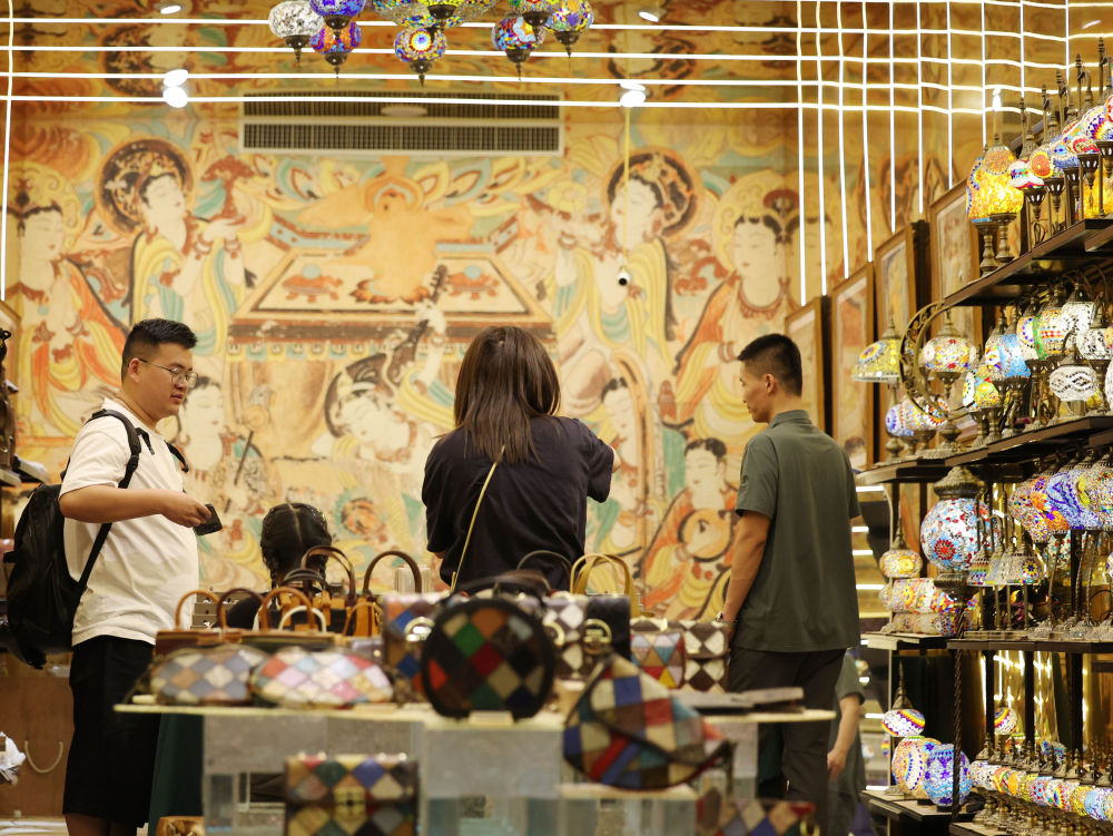 2025年6月26日,游客在敦煌夜市選購文創(chuàng)產品。今年以來,敦煌市全面改造敦煌夜市等特色街區(qū),圍繞敦煌深厚的歷史文化底蘊,融入壁畫、絲路文化等元素,通過布設文化景觀小品、打造沉浸式餐飲體驗空間、上線特色文創(chuàng)產品等方式,給游客帶來多元體驗,“夜經濟”持續(xù)升溫,不斷釋放文旅消費潛力。