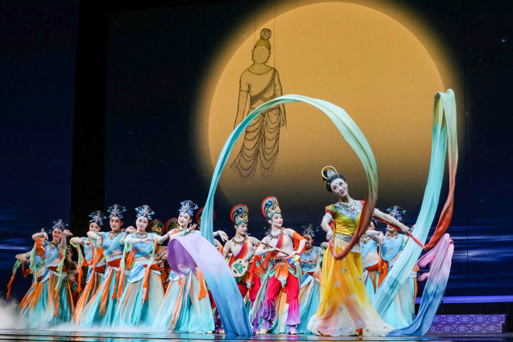 2025年9月22日,在敦煌舉辦的“相約敦煌”國際文化交流演出活動上,甘肅省演藝集團的演員展演《樂動敦煌》選段?!稑穭佣鼗汀方柚鷮δ呖弑诋嫛⒉亟浂垂偶慕庾x梳理,活化敦煌古樂器、古樂譜研發(fā)成果,通過全息投影等手段,結合專業(yè)演員的表演,將莫高窟壁畫中的樂舞盛景生動再現(xiàn),讓觀眾沉浸式感悟傳承千年的敦煌樂舞文化魅力。