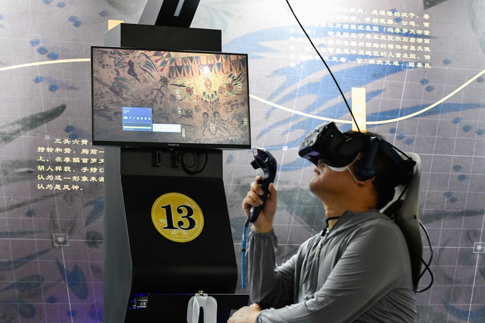 2024年7月22日,一名游客在敦煌莫高窟“尋境敦煌——數(shù)字敦煌沉浸展”上借助VR設備沉浸式游覽莫高窟第285窟虛擬場景?!皩ぞ扯鼗汀本C合運用了VR虛擬現(xiàn)實、三維建模、游戲引擎的物理渲染和全局動態(tài)光照等新技術,高精度立體還原了莫高窟第285窟。游客戴上VR眼鏡,不僅可以零距離觀賞壁畫、360度自由探索洞窟細節(jié),還能“飛升”到窟頂,身臨其境參與壁畫故事情節(jié),沉浸式感受敦煌文化的魅力。