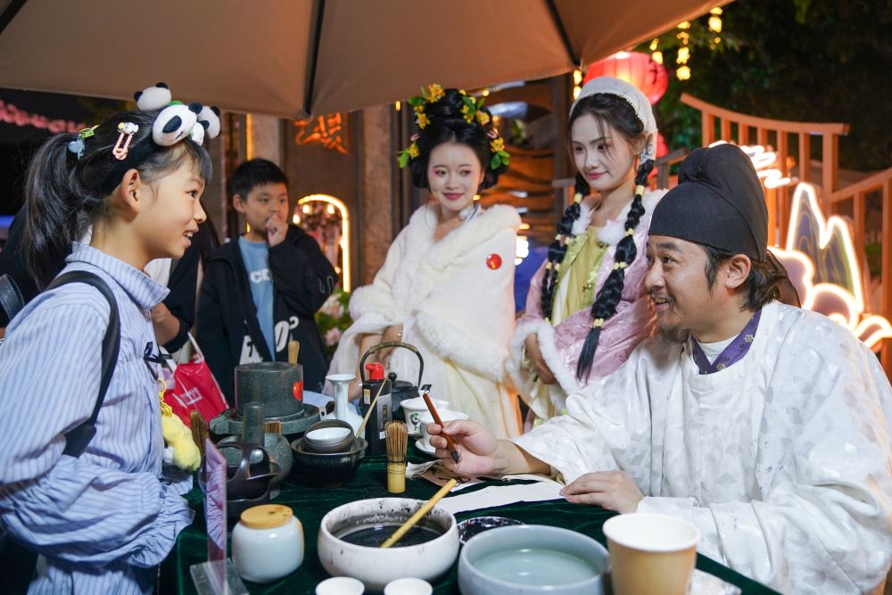 2024年10月4日,在四川省成都市東門碼頭夜游錦江項(xiàng)目推出的“錦夜慶華誕·璀璨耀蓉城”國慶系列主題活動上,“李白”(右)與小朋友互動對詩。
