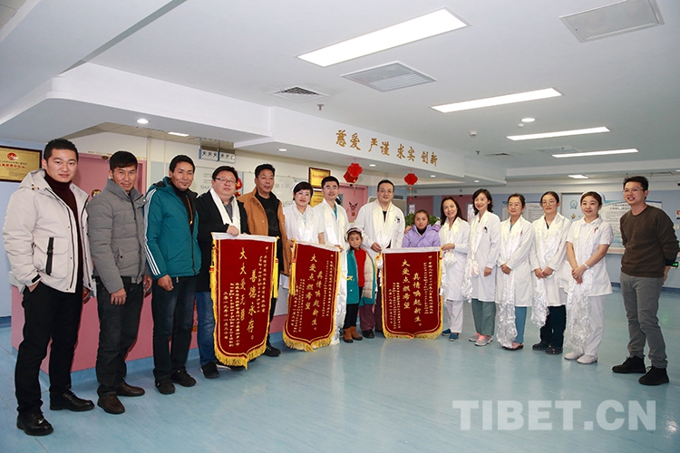 返鄉(xiāng)前,洛桑曲宗和次旦德吉在親屬和小學校長的帶領下來到兒研所,向醫(yī)護人員和共鑄中國心組委會的工作人員獻上了哈達和錦旗,表達感激之情。醫(yī)護人員也向兩個孩子贈送了書包等文具,鼓勵他們回校后好好學習。