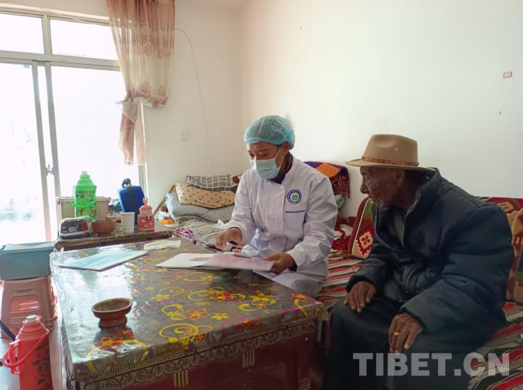 圖為恩惠苑第一書記旦達(中)同社區(qū)醫(yī)護人員一同入戶開展醫(yī)療服務(wù)