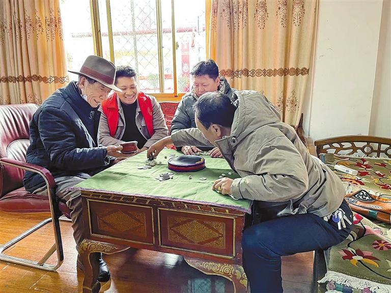 圖為74歲的次仁朗杰老人和朋友在魯固社區(qū)養(yǎng)老服務驛站玩藏式骰子游戲。記者 央金 攝