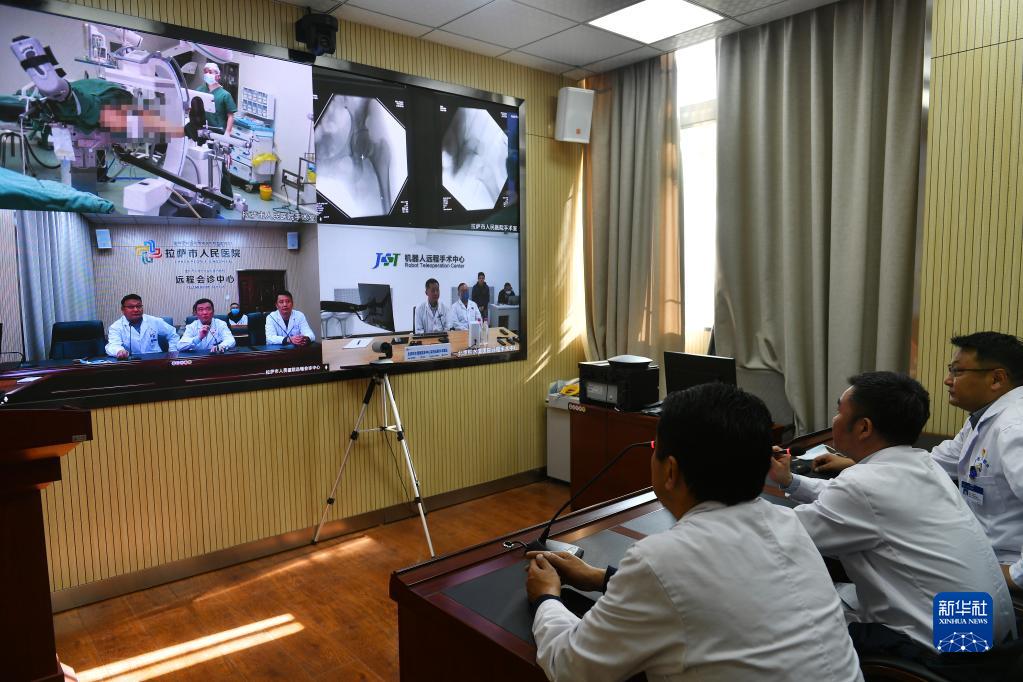 拉薩市人民醫(yī)院骨科醫(yī)生在北京積水潭醫(yī)院專家遠(yuǎn)程指導(dǎo)下使用骨科機(jī)器人開展骨科手術(shù)(2021年4月19日攝)。新華社記者 孫瑞博 攝