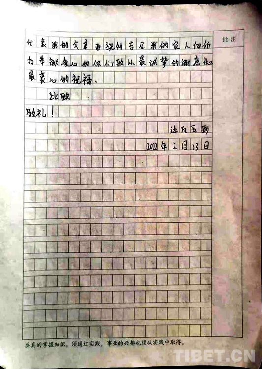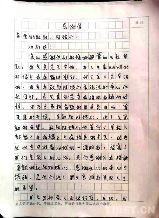 中國西藏網(wǎng)訊 “親愛的叔叔、阿姨們,您們好,衷心感謝你們的慷慨解囊和無私幫助......!”近日,西藏自治區(qū)林芝市巴宜區(qū)更章門巴民族鄉(xiāng)(以下簡稱:更章鄉(xiāng))門仲村村民西繞多吉女兒達(dá)娃玉珍向更章鄉(xiāng)新時代文明實踐所發(fā)來了一封感謝信,字里行間充滿著感激之情,而背后的暖心故事更讓人溫暖與感動。