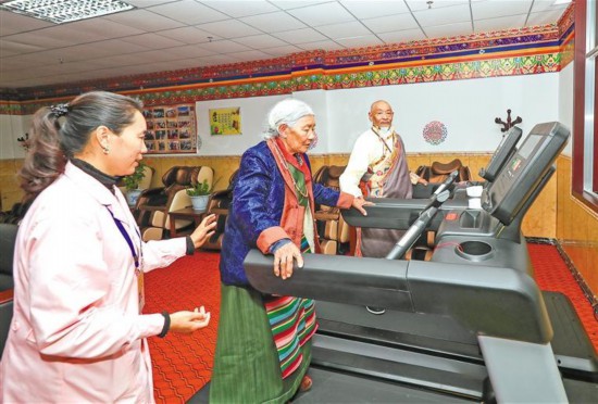 圖為在阿里地區(qū)噶爾縣老人集中供養(yǎng)中心,農(nóng)村特困老人在工作人員指導(dǎo)下進(jìn)行運(yùn)動。記者 格桑吉美 攝