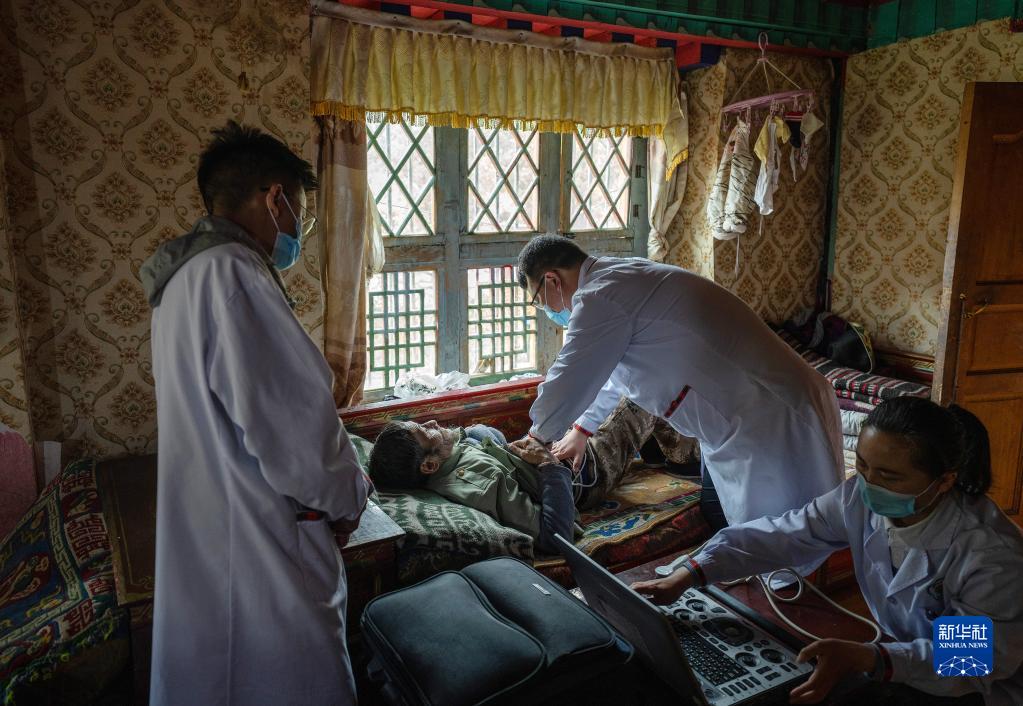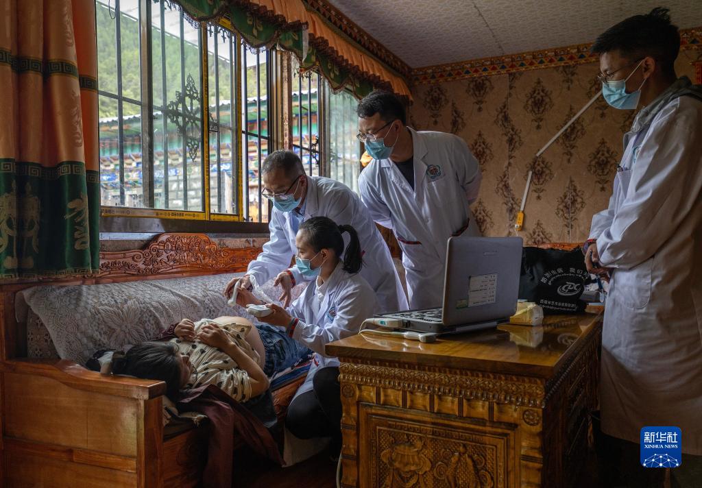 6月12日,王振疆(右一)和尼瑪益西(右下)在吞不絨村為阿珍診治。新華社記者 費茂華 攝