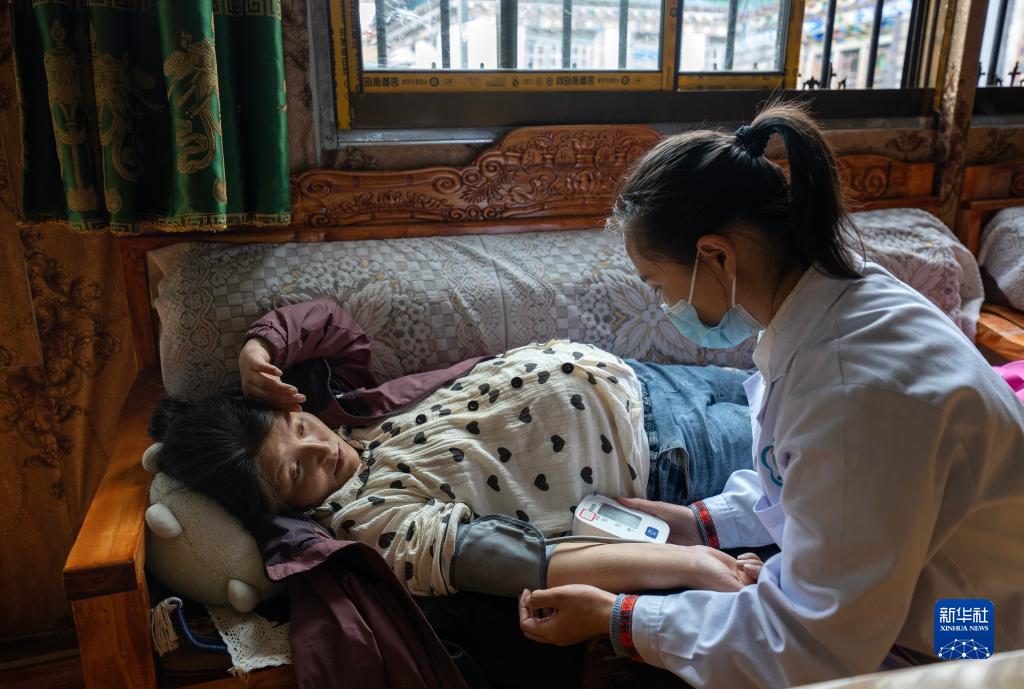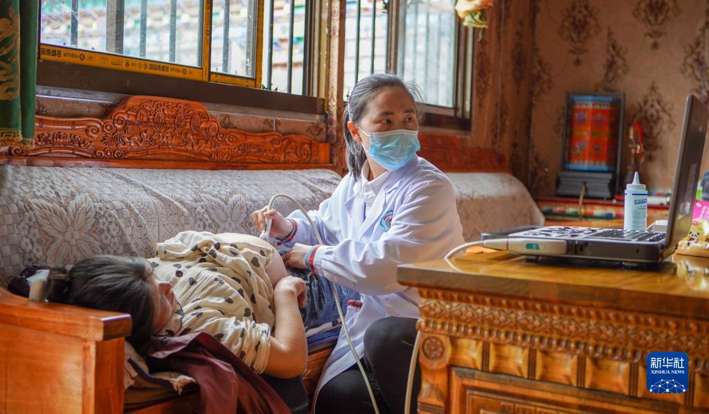 6月12日,陳冰醫(yī)生(右一)在給產婦扎西央宗做產檢。新華社記者 邵澤東 攝