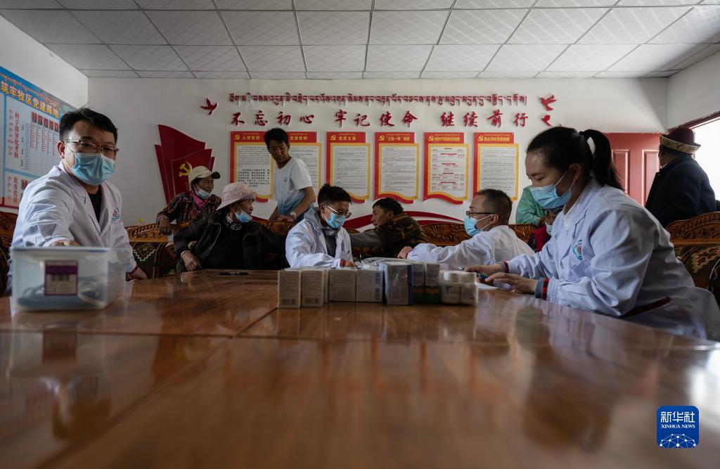 6月12日,王振疆(前右二)、王彤旭(前左一)、陳冰(前右一)和尼瑪益西(前左三)在村委會會議室為患者診治。新華社記者 費茂華 攝