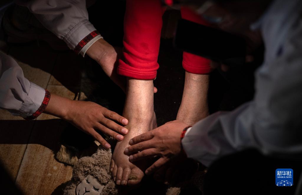 6月12日,王振疆(右二)在查看次仁旺姆的手指關節(jié)。新華社記者 費茂華 攝
