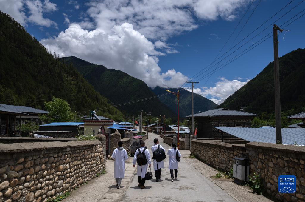 6月12日,入戶診治結束后,王振疆(左二)、王彤旭(右二)、陳冰(右一)和尼瑪益西走向村委會。新華社記者 費茂華 攝