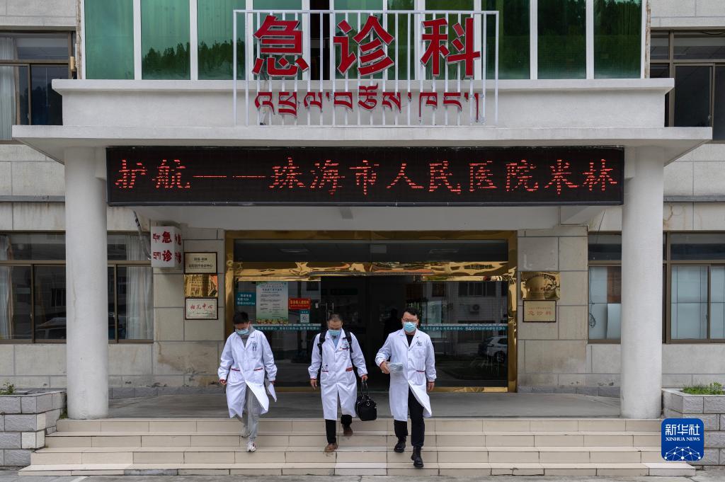 6月12日,王振疆(中)、尼瑪益西(左)和王彤旭走出米林市人民醫(yī)院的急診大樓。新華社記者 費茂華 攝