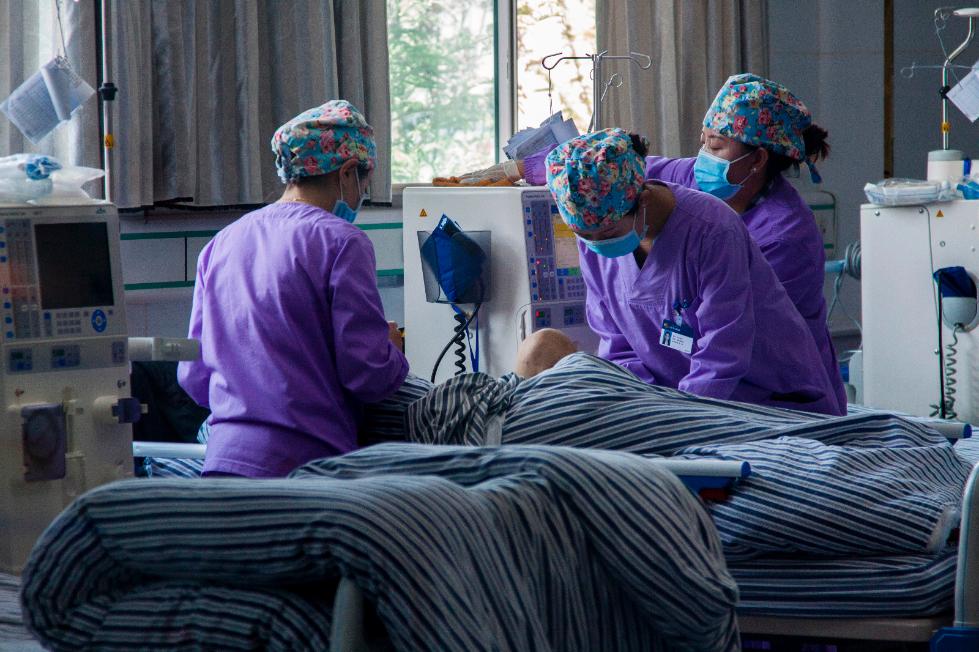 圖為血液透析中心的護士們在為病人護理。拉薩市人民醫(yī)院血液透析中心成立于2017年3月,采用最先進的德國設(shè)備,現(xiàn)已陸續(xù)開展了血液透析、血液灌流、血液透析濾過等技術(shù),月均透析達百余人次,目前已完成透析3233人次。