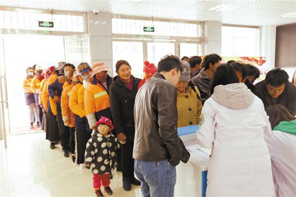 圖為類烏齊縣人民醫(yī)院為全縣環(huán)衛(wèi)工人進行免費健康體檢活動現(xiàn)場。