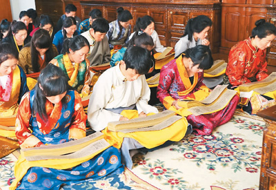 西藏藏醫(yī)學院的學生正在研讀記載著藏醫(yī)藥浴法相關知識的《四部醫(yī)典》。劉罡攝中國非物質(zhì)文化遺產(chǎn)保護中心供圖