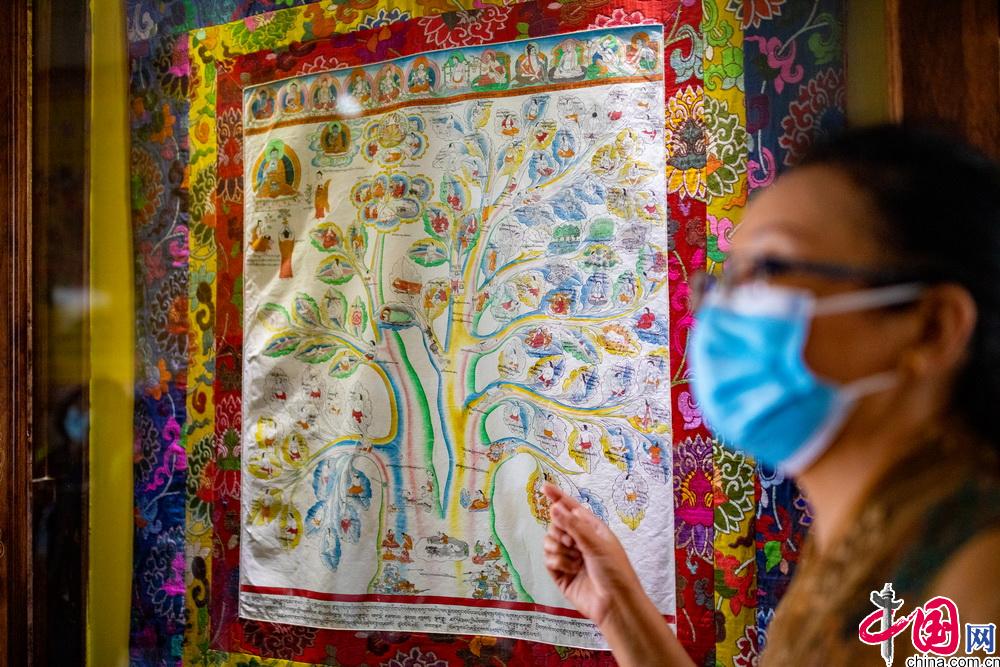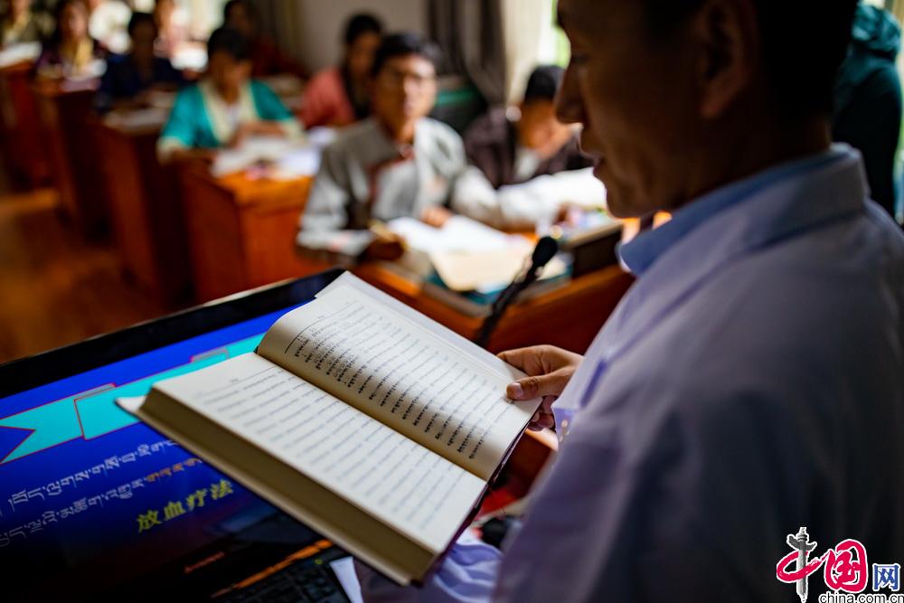 西藏藏醫(yī)藥大學(xué)開(kāi)設(shè)特色鮮明的藏醫(yī)藥學(xué)唐卡教學(xué)課程。現(xiàn)有醫(yī)學(xué)唐卡由十七世紀(jì)藏醫(yī)藥大家第司.桑杰嘉措創(chuàng)建,距今已有300多年的歷史。醫(yī)學(xué)唐卡用歸納、總結(jié)的方式將藏醫(yī)藥典籍《四部醫(yī)典》的主要內(nèi)容以“樹(shù)喻”方式繪示出來(lái)。成書(shū)于1300多年的《四部醫(yī)典》是藏醫(yī)藥學(xué)理論的根本大典。包括總則醫(yī)典、論述醫(yī)典、秘訣醫(yī)典和后續(xù)醫(yī)典。內(nèi)容涵蓋藏醫(yī)生理學(xué)、病理學(xué)、診斷學(xué)、治療學(xué)等基礎(chǔ)理論,細(xì)化了婦科、兒科、內(nèi)科、外傷等學(xué)科,包含了解剖學(xué)、護(hù)理學(xué)、藥學(xué)等眾多學(xué)科。圖為學(xué)校老師在對(duì)醫(yī)學(xué)唐卡進(jìn)行講解。中國(guó)網(wǎng)記者 鄭亮攝
