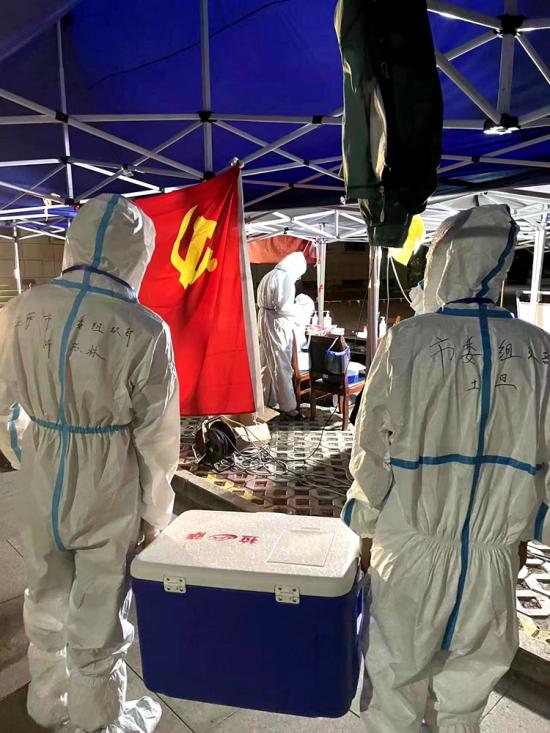 圖為黨旗飄揚在核酸檢測點上攝影:普瓊
