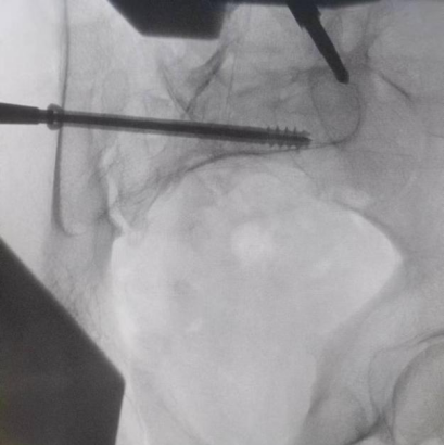 圖為透視下見(jiàn)置入的骶髂螺釘,位置、長(zhǎng)度精準(zhǔn),無(wú)絲毫偏差