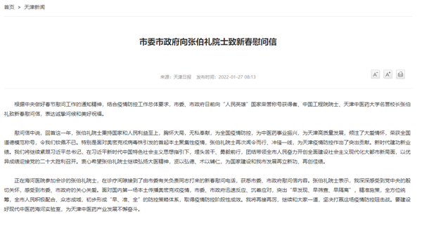 慰問(wèn)信中說(shuō),回首這一年,張伯禮院士秉持國(guó)家和人民利益至上,胸懷大局,無(wú)私奉獻(xiàn),為全國(guó)疫情防控,為中醫(yī)藥事業(yè)振興,為天津高質(zhì)量發(fā)展,傾注了大愛(ài)情懷,榮獲全國(guó)道德模范稱(chēng)號(hào),令我們欽佩不已。特別是面對(duì)奧密克戎病毒株引發(fā)的首起本土聚集性疫情,張伯禮院士再次聞令而行、沖鋒一線(xiàn),為天津疫情防控作出了突出貢獻(xiàn)。新時(shí)代建功新業(yè)績(jī)。
