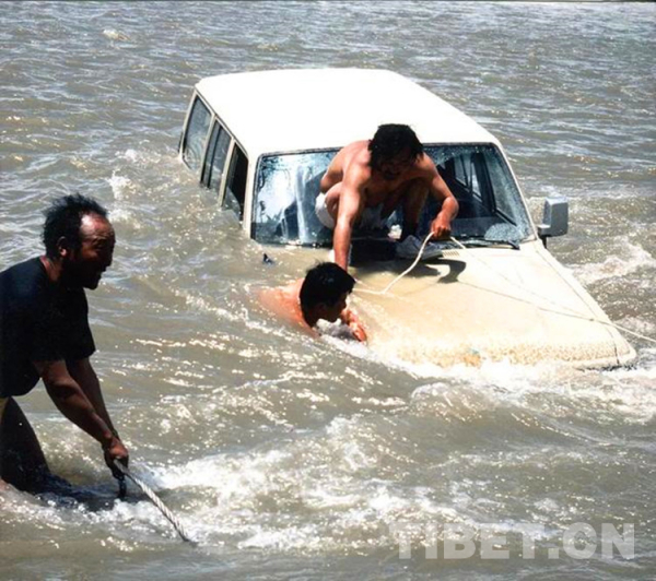 圖為1994年,李永憲(中)、丹扎(左)、旺堆次仁在拯救翻進(jìn)河水中的考古隊的車