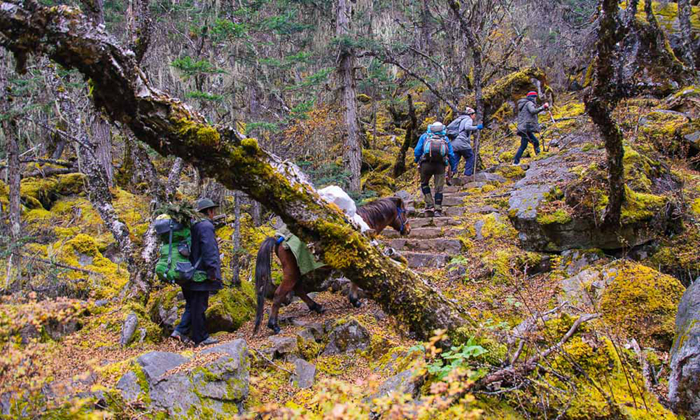 海拔較高的巴松措,秋日來的晚了一些,但秋日的痕跡已爬上樹梢。