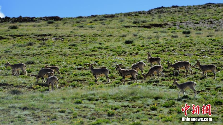 9月2日,多只藏原羚和巖羊在西藏山南羊卓雍錯湖畔覓食。當?shù)亟陙聿粩嗉哟蟊Wo力度,環(huán)境日益趨好,野生動物種群正在逐漸恢復、增長。中新社記者 江飛波 攝