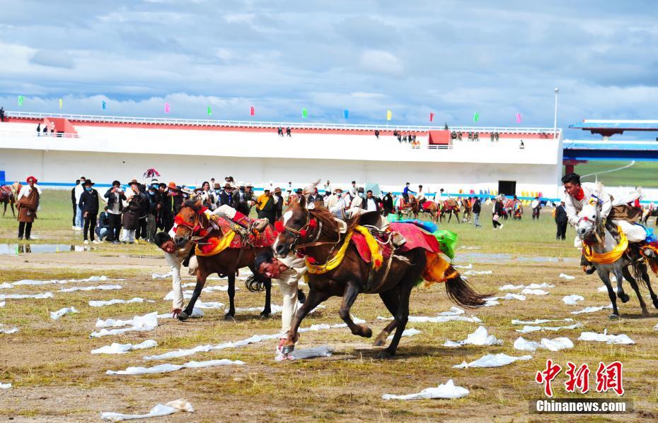8月11日,藏北騎手表演跑馬拾哈達(dá)。8月10日,2020年那曲羌塘恰青格薩爾賽馬藝術(shù)節(jié)在西藏那曲市開幕。中新社記者 張偉 攝
