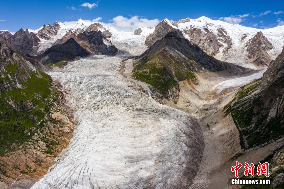 約雄冰川距離巴青縣城約85公里,冰川所在區(qū)域屬于國家級濕地保護區(qū),主要由冰川下游冰緣區(qū)的湖泊水域、河流、沼澤化草甸及流域匯水區(qū)的部分水源林地組成。圖為航拍約雄冰川。 何蓬磊 攝