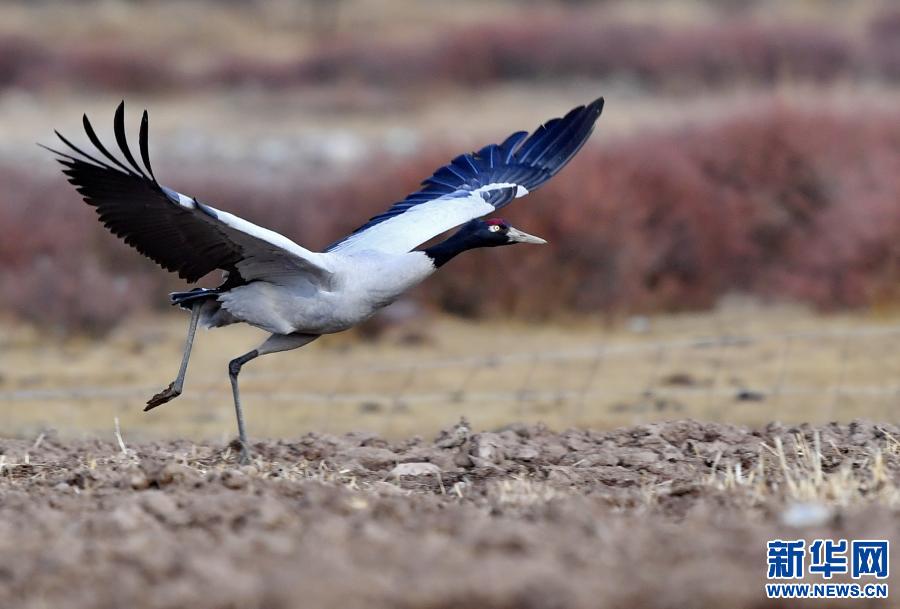 一只黑頸鶴在林周縣的農(nóng)田里起飛(3月14日攝)。新華社記者 張汝鋒 攝