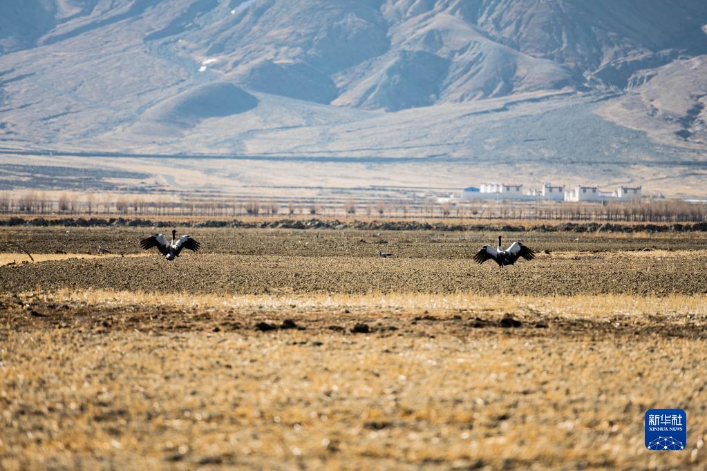 這是在西藏日喀則市桑珠孜區(qū)的農(nóng)田里拍攝的黑頸鶴(3月12日攝)。新華社記者 周荻瀟 攝