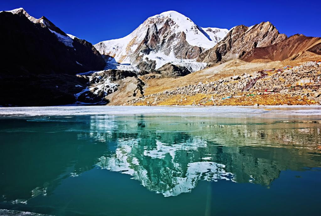 從平緩的草地步入山谷,溪水流下,冰湖上的山峰倒影如夢幻般美麗。目之所及,除了零星經(jīng)過的巖羊和雪雞,唯有肅穆雄偉的山峰;耳之所聞,除了偶爾傳來的冰川融化的碎裂聲外,只余亙古不變常伴耳畔的風(fēng)聲。