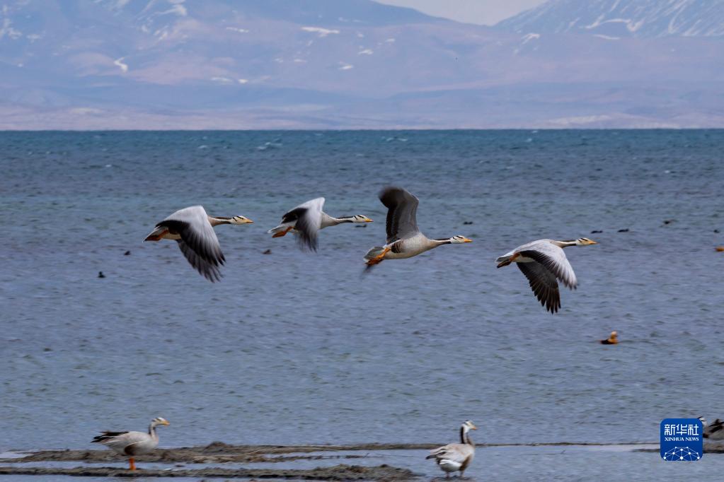 4月22日,鳥類在西藏阿里地區(qū)普蘭縣境內(nèi)瑪旁雍錯(cuò)飛翔。新華社發(fā)(劉曉東攝)
