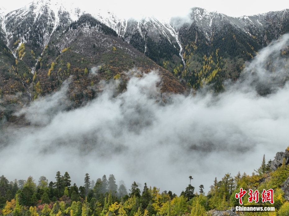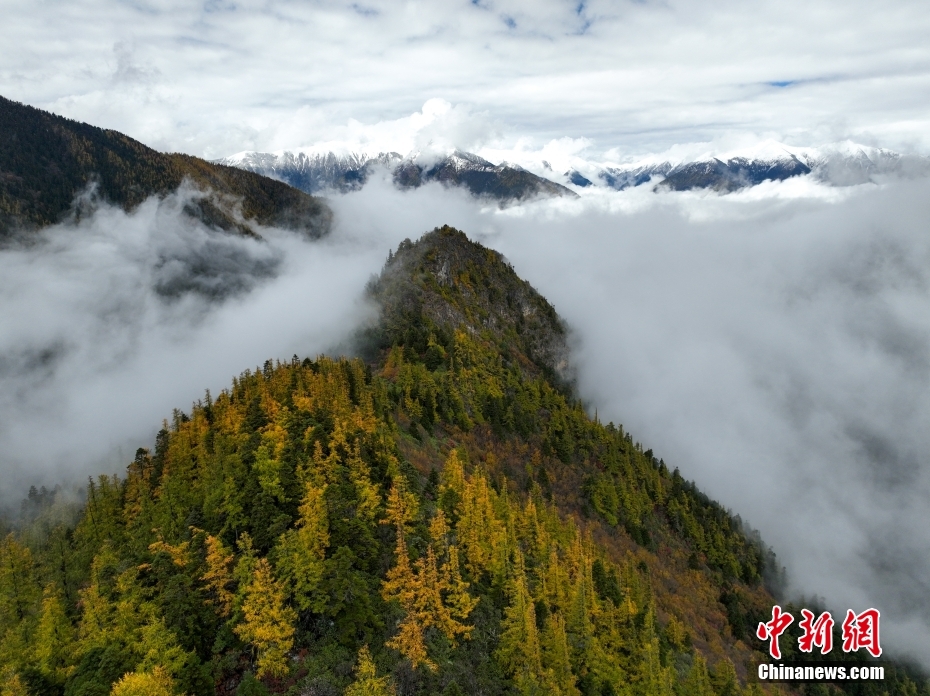 10月26日,航拍西藏多雄拉雪山,雪山與層林盡染的森林組成一幅壯美的秋日高原畫(huà)卷。西藏林芝多雄拉雪山位于喜馬拉雅山脈北段主脊,曾是徒步進(jìn)入墨脫縣最艱險(xiǎn)的路段之一。(無(wú)人機(jī)照片) 中新社發(fā) 董志雄 攝