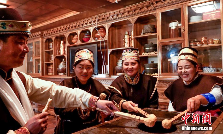 11月24日恰逢藏歷十月初一,西藏林芝迎來(lái)2023年工布新年,這是西藏最早的新年。工布新年以其悠久的歷史、鮮明的特色、豐富的內(nèi)涵,于2006年被列入第一批西藏自治區(qū)非物質(zhì)文化遺產(chǎn)保護(hù)名錄。圖為人們?cè)诨鹕峡竟?jié)日美食“結(jié)達(dá)”。 阿仁 攝
