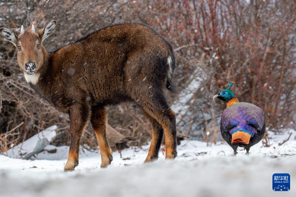 1月17日拍攝于西藏山南市洛扎縣的喜馬拉雅斑羚和棕尾虹雉。新華社記者 旦增尼瑪曲珠 攝