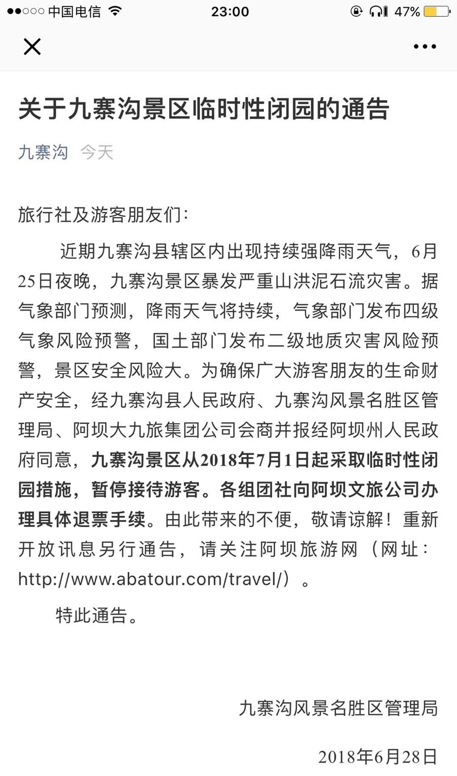 中國(guó)西藏網(wǎng)訊 6月28日晚,九寨溝風(fēng)景名勝區(qū)管理局在其官微發(fā)布題為《關(guān)于九寨溝景區(qū)臨時(shí)性閉園的通告》稱,因天氣原因造成景區(qū)風(fēng)險(xiǎn)大,九寨溝景區(qū)從2018年7月1日起采取臨時(shí)性閉園措施,暫停接待游客。
