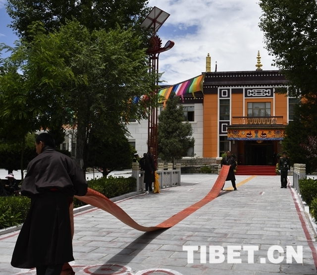 在位于拉薩市區(qū)的班禪行宮雪林多吉頗章大院內(nèi),一場更加熱烈的儀式也即將進行。在雪林多吉頗章主殿前,僧人們提前繪制了金剛結(jié)等吉祥圖案,一條尺許寬的地毯從歡迎隊伍處一直延伸到主殿門前。來自拉薩各大寺廟的僧眾代表和拉薩信教群眾代表,帶著虔誠和喜悅的心情,翹首以盼十一世班禪的到來。